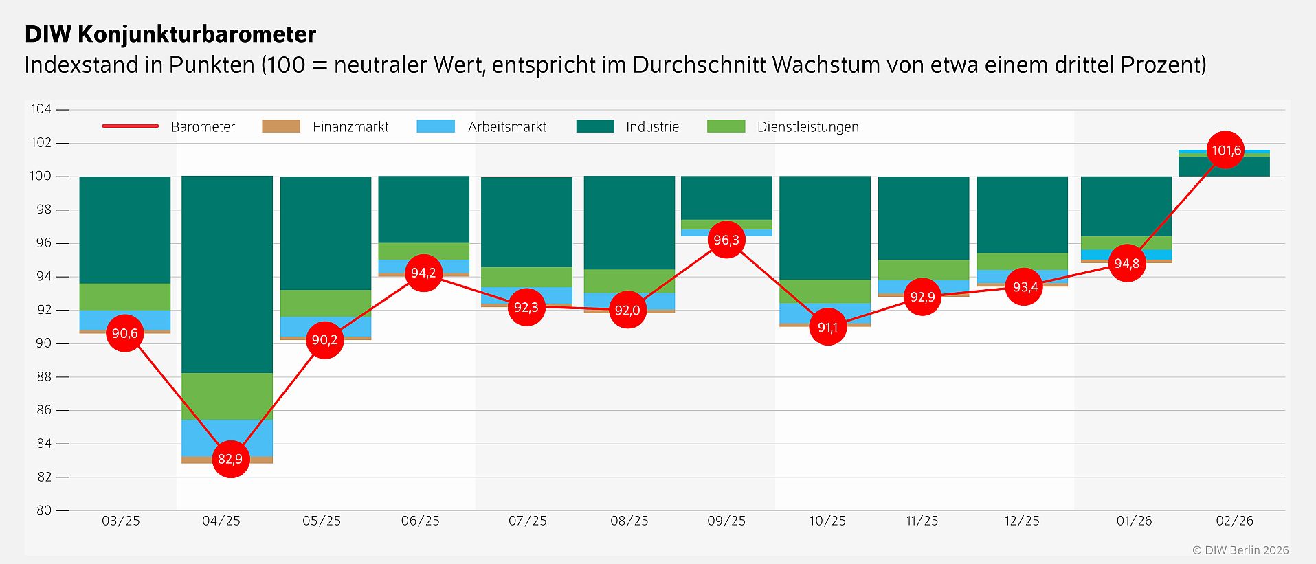Das Konjunkturbarometer des Deutschen Instituts für Wirtschaftsforschung (DIW Berlin) macht im Februar einen Sprung auf 101,6 Punkte. Damit liegt das Barometer fast sieben Punkte über dem Januar-Wert und erstmals seit knapp drei Jahren wieder über der neutralen 100-Punkte-Marke, die ein durchschnittliches Wachstum der deutschen Wirtschaft anzeigt. »Die Signale, dass Deutschland in diesem Jahr den Weg…