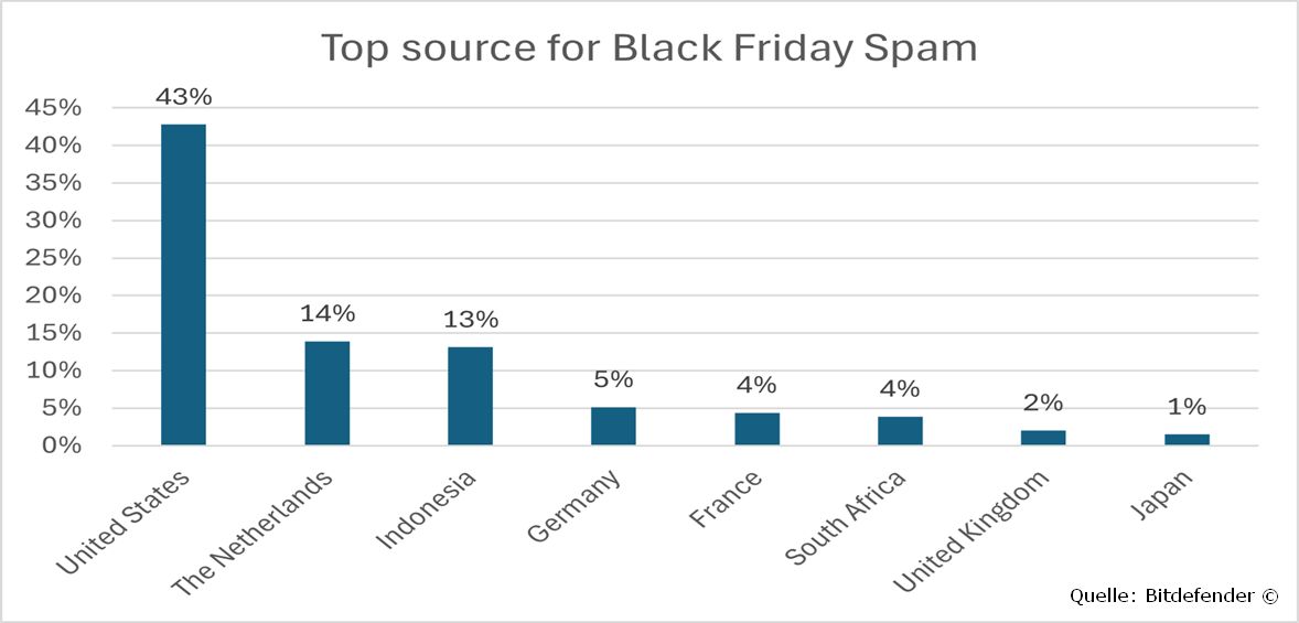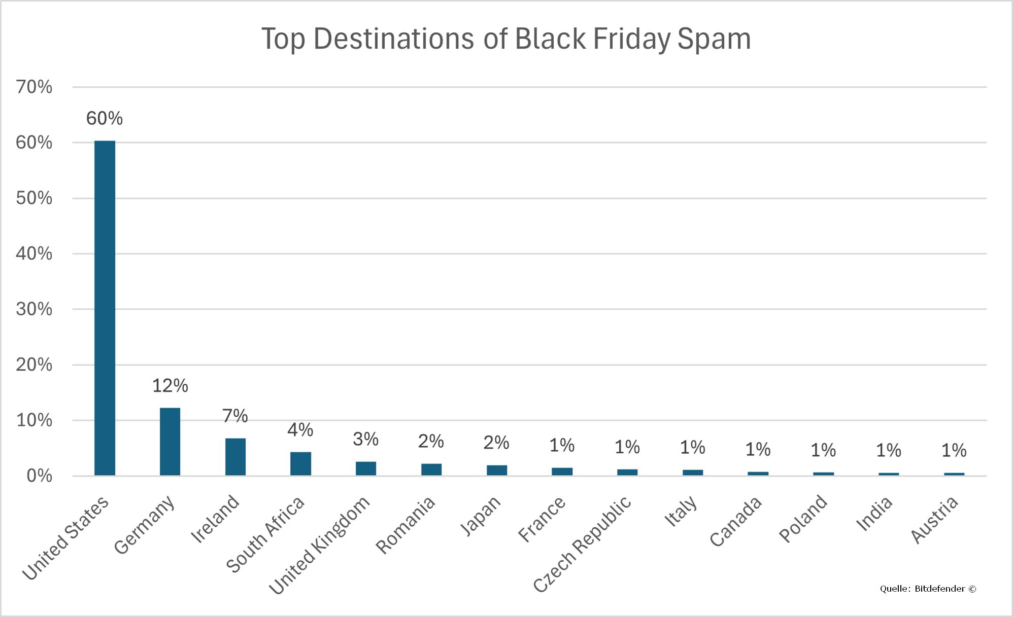 Deutschland ist ein wichtiges Ziel für 12 Prozent des Black-Friday-Spams. Damit liegt der Anteil deutscher Adressaten zwar deutlich hinter den USA mit 60 Prozent, aber klar vor den folgenden Nationen: Irland (7 Prozent), Südafrika (4 Prozent) und Großbritannien (3 Prozent). 43 Prozent des Spams stammte aus den USA. Die Vereinigten Staaten liegen damit vor den Niederlanden (14 Prozent) und Indonesien (13 Prozent).