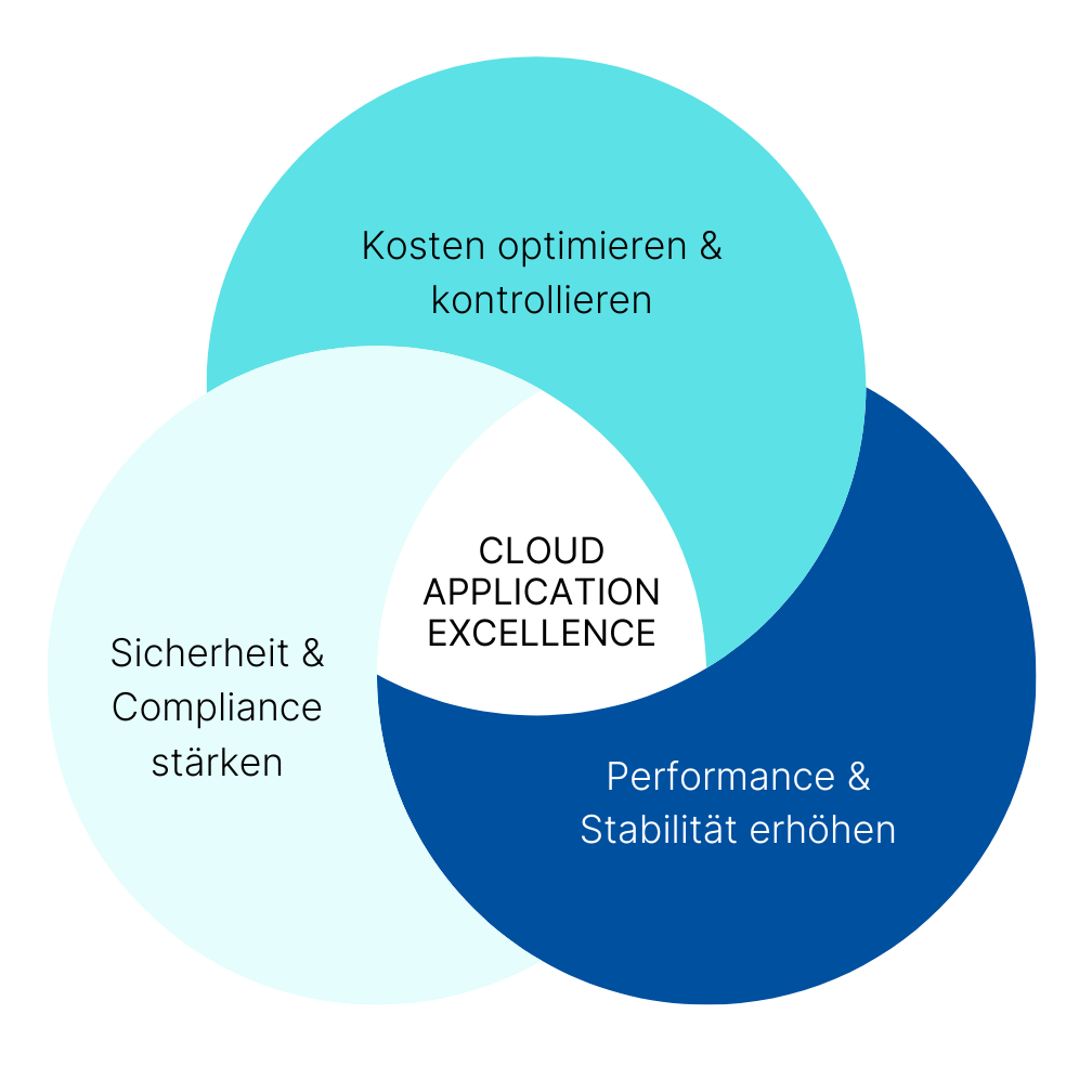 Abbildung: Cloud Application Excellence bedeutet, die Kosten im Griff zu haben, die Sicherheit und Compliance zu stärken und gleichzeitig die Performance und Stabilität zu erhöhen. Dort wo alle drei Faktoren zusammenkommen, entsteht echter Geschäftswert.