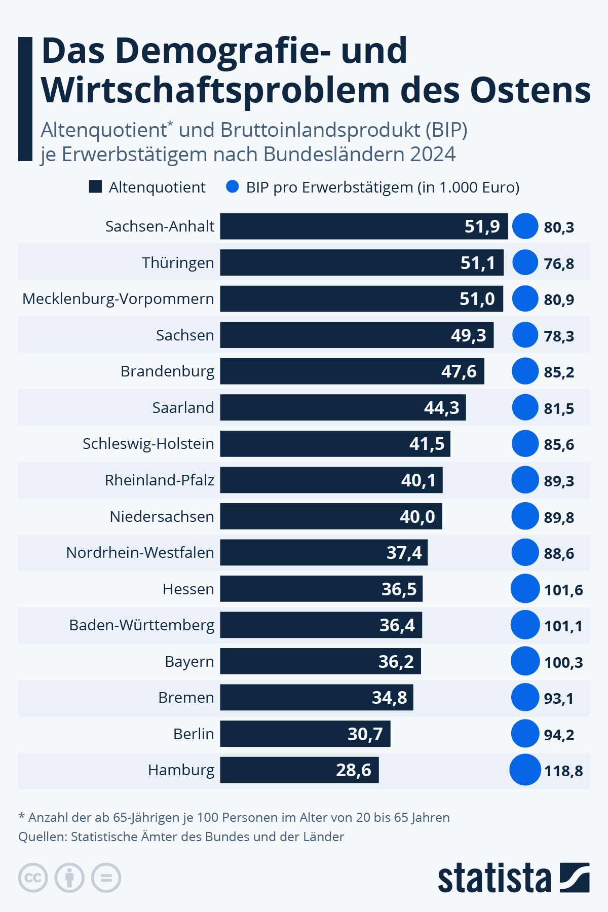 Bei der Wirtschaftsleistung weisen die ostdeutschen Bundesländer mit Ausnahme von Brandenburg ein Bruttoinlandsprodukt je Erwerbstätigen von unter 80.000 Euro auf. Sieben Länder liegen zwischen 80.000 und 90.000 Euro, sechs Länder über 90.000 Euro. Spitzenreiter ist Hamburg mit über 110.000 Euro. Hamburg weist zudem auch den niedrigsten Altersquotienten aller Bundesländer auf. Auch bei anderen wirtschaftlichen Kennzahlen liegt der Osten noch hinter dem Westen.