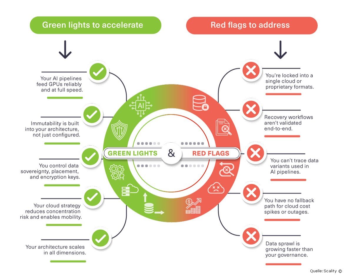 Welchen Herausforderungen und Risiken waren die digitalen Infrastrukturen im Jahr 2025 ausgesetzt, und welche zentralen Anforderungen für eine widerstandsfähige Datenarchitektur leiten sich daraus im Jahr 2026 ab? Insbesondere KI-Bereitschaft, Unveränderbarkeit, Souveränität und Cloud-Resilienz stehen im Fokus. Eine Scorecard signalisiert mit grünen Signalen eine zukunftssichere Datenbasis und rote Warnsignale zeigen auf verborgene Risiken wie Vendor-Lock-in, ungetestete Wiederherstellungsprozesse und fehlende Datenherkunft. Unternehmen müssen ihre Speicher- und Datenmobilitätsstrategien sowie Governance und Wiederherstellungsfähigkeit gezielt stärken, um den gestiegenen Anforderungen an Sicherheit, Compliance und betriebliche Resilienz gerecht zu werden.
