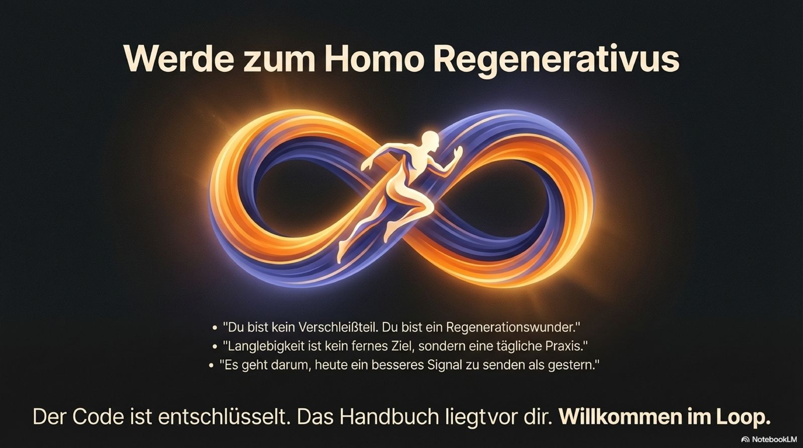 Der Longevity Loop ist kein starres Regelwerk, sondern eine Anleitung zur Selbstermächtigung. Indem wir lernen, die Signale der Umgebung (Sense-Omics) bewusst zu gestalten und unseren Alltag in Phasen der Aktivierung und Regeneration zu takten, verlassen wir die Rolle des passiven Passagiers. Wir werden zum Piloten unseres biologischen Systems. Altern wird von einem Schicksal zu einer gestaltbaren Variable. Willkommen im Loop!