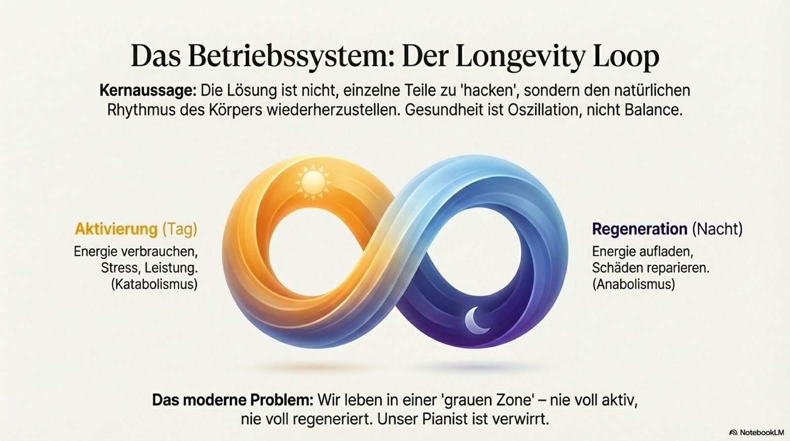 Wie wecken wir diese Reparaturmechanismen? Nicht durch Zufall, sondern durch Rhythmus. Das Leben ist oszillierend. Herzschlag, Atmung, Schlaf-Wach-Rhythmus – alles verläuft in Wellen. Wer in der Mitte starr verharrt (Stagnation), stirbt biologisch. Der Longevity Loop basiert auf dem Wechsel zwischen zwei funktionalen Zuständen, die wir täglich durchlaufen müssen: