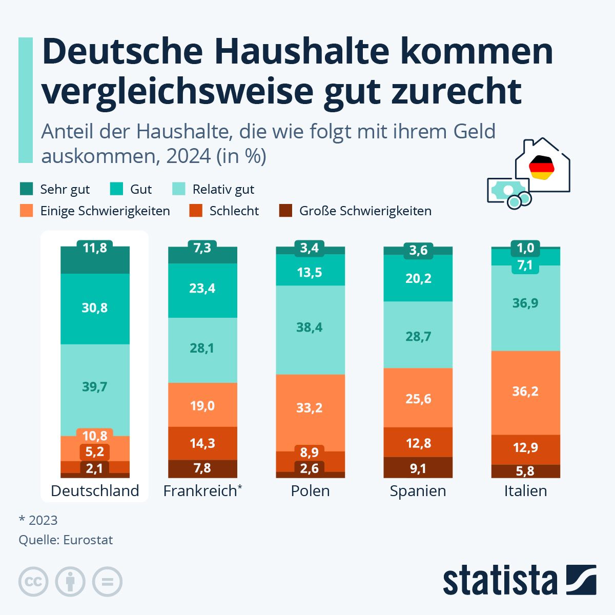 Im EU-Vergleich ist das ein Spitzenwert – in Spanien und Italien liegt der Anteil der Haushalte, die gut auskommen, bei nur etwa 50  % bzw. 45  %.