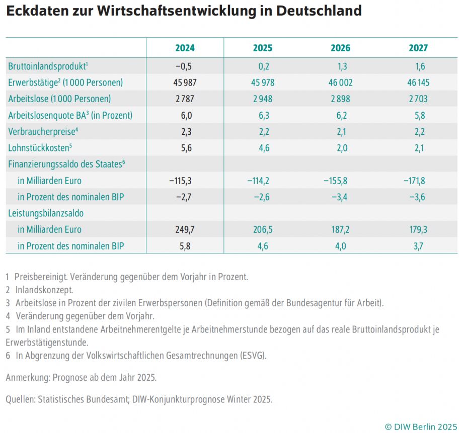»Der prognostizierte Aufschwung darf nicht als gesicherte Wende interpretiert werden«, mahnt DIW-Präsident Marcel Fratzscher. »Die Entwicklung wird maßgeblich von staatlichen Impulsen und temporären Entlastungseffekten bestimmt.« Strukturelle Herausforderungen wie demografische Entwicklung, Energiewende, Defizite bei Innovation und Produktivität sowie der Modernisierungsbedarf staatlicher Institutionen blieben bestehen. Eine nachhaltige Trendwende erfordert deutlich mehr private Investitionen, Produktivitätsfortschritte und eine zügige Transformation der Wirtschaft in zentralen Bereichen.