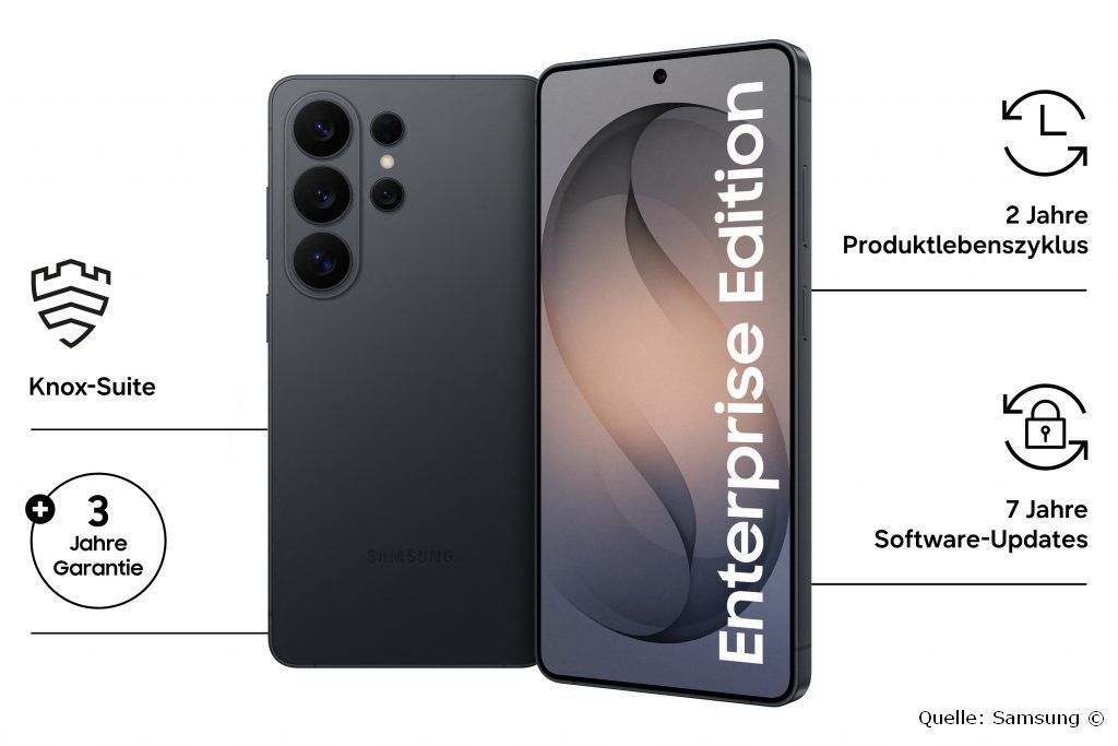Die Enterprise-Modelle Samsung Galaxy S26 Ultra und Samsung Galaxy S26 sind ab dem 11. März 2026 erhältlich. Auch für die IT-Teams gibt es gute Nachrichten: Fortschrittliche EMM-Lösungen (Enterprise Mobility Management) ermöglichen die zentrale Verwaltung einzelner Geräte ebenso wie das Management ganzer Geräteflotten. Samsung bietet für die Geräte sieben Jahre Updates10 – für einen langen Lebenszyklus. Samsung Care+ for Business11 kann je nach Schutzumfang die Unternehmensgeräte zudem vor Schäden schützen. Eine durchdachte Auswahl an Business-Zubehör – von kompatiblen Schutzhüllen12 bis zum neuen magnetischen Zusatzakku13 – ergänzen das Angebot für den Unternehmenseinsatz.