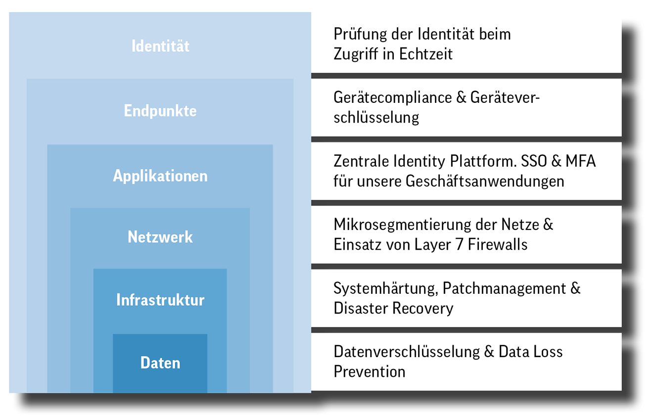 Das Fundament einer Sicherheitsstrategie bilden Sicherheitskonzepte wie »Zero Trust«, ein Schutz auf allen Ebenen – von den Daten bis zur Identität.