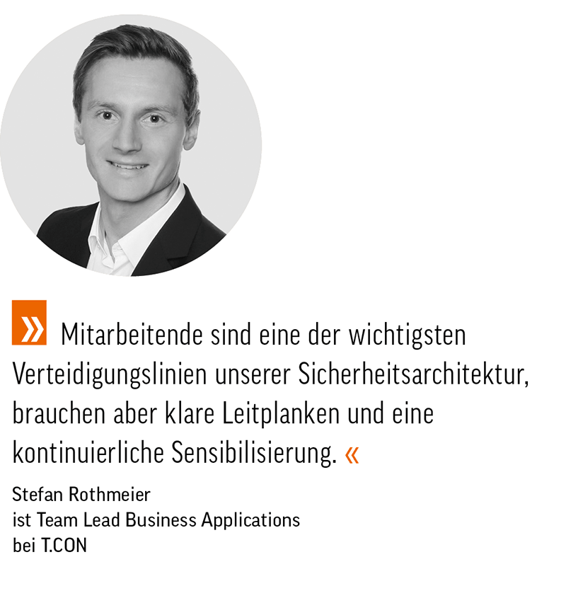 Stefan Rothmeier: Mitarbeitende sind eine der wichtigsten Verteidigungslinien unserer Sicherheitsarchitektur. Damit sie Sicherheitsvorfälle frühzeitig erkennen und richtig reagieren, brauchen sie klare Leitplanken und eine kontinuierliche Sensibilisierung. Die Informationssicherheit und Compliance stellen hierfür verbindliche Rahmenbedingungen für den sicheren Umgang mit Geräten, Identitäten, Anwendungen und Cloud-Diensten bereit – und unterstützen durch regelmäßige, praxisnahe Awareness-Maßnahmen. Dazu gehören die kritische Prüfung externer E-Mails, ein verantwortungsvoller Umgang mit Passwörtern und Identitäten, eine sichere Internet- und Cloud-Nutzung sowie der bewusste Umgang mit personenbezogenen und vertraulichen Daten.