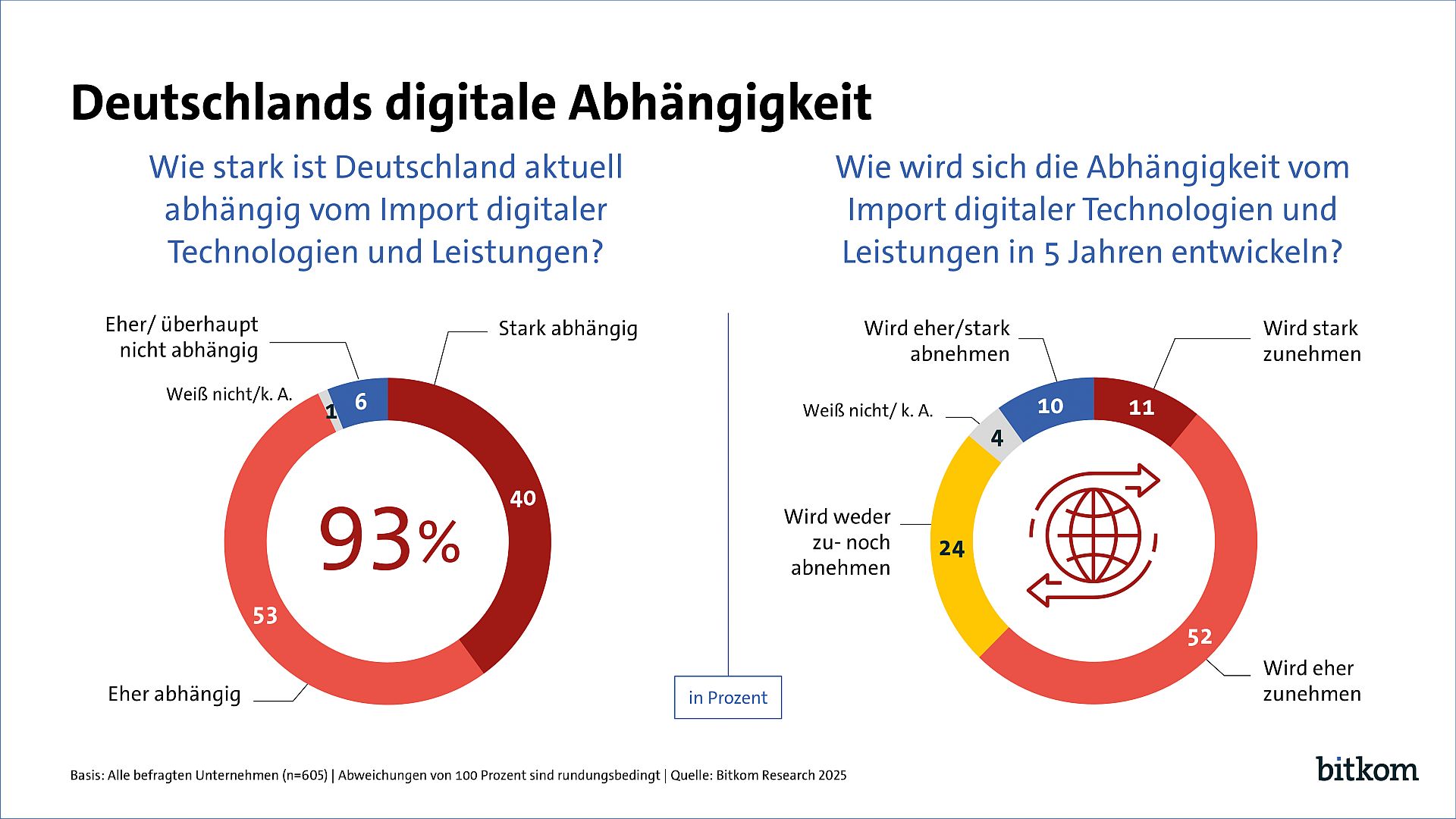 Die deutsche Wirtschaft ist stark abhängig von digitalen Technologien und Dienstleistungen aus dem Ausland, insbesondere aus den USA und China. Diese Abhängigkeit hat sich im Laufe des Jahres 2025 weiter verstärkt, wobei das Vertrauen in die USA aufgrund politischer Unsicherheiten schwindet. Nur 4 Prozent der Unternehmen wären dauerhaft überlebensfähig, wenn diese Importe wegfallen würden. Der bevorstehende Gipfel für europäische digitale Souveränität am 18. November in Berlin soll den Startschuss für mehr Unabhängigkeit und die Entwicklung eigener digitaler Technologien geben. Bitkom-Präsident Dr. Ralf Wintergerst betont die Notwendigkeit, Europas digitale Zukunft selbst in die Hand zu nehmen.