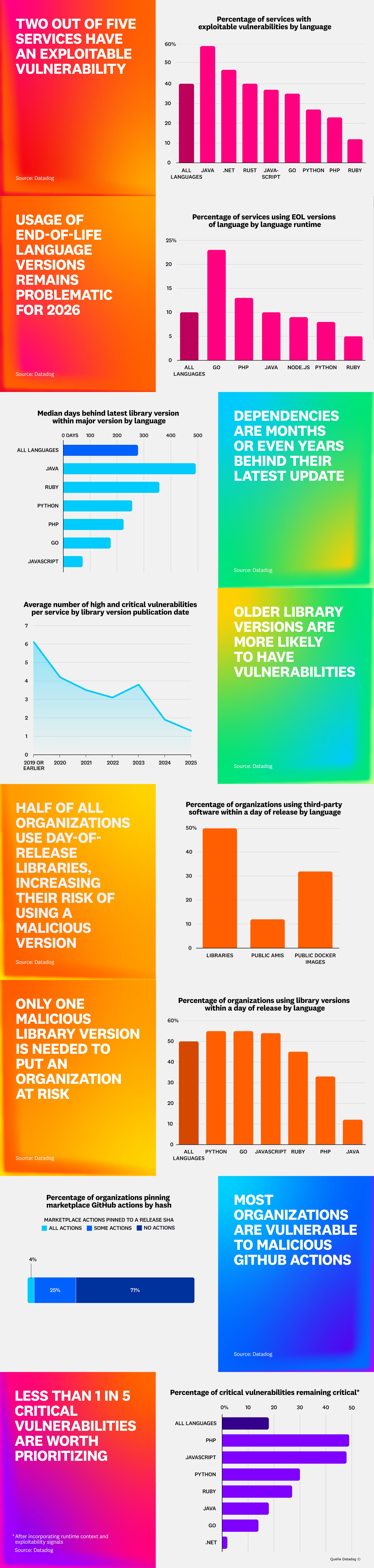 [1] Datadog analysierte Telemetriedaten aus Zehntausenden von Anwendungen, um Sicherheitsrisiken in modernen Software-Umgebungen zu bewerten, sowie zusätzliche Datensätze, die für spezifische Ergebnisse genutzt wurden. Die Datenbasis ist global. https://www.datadoghq.com/state-of-devsecops/