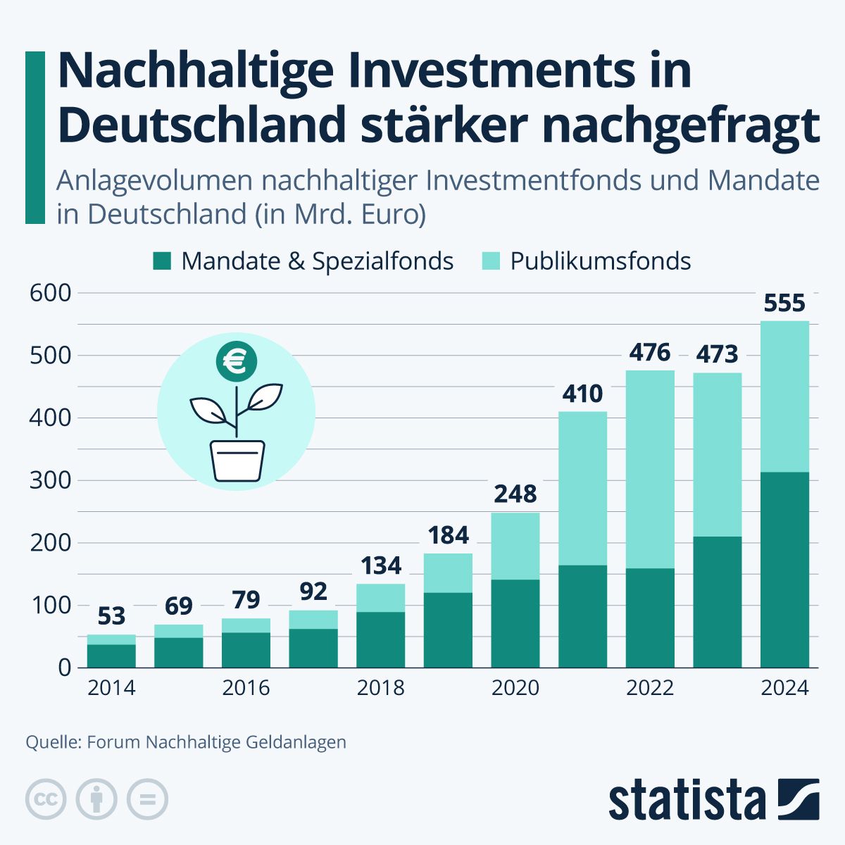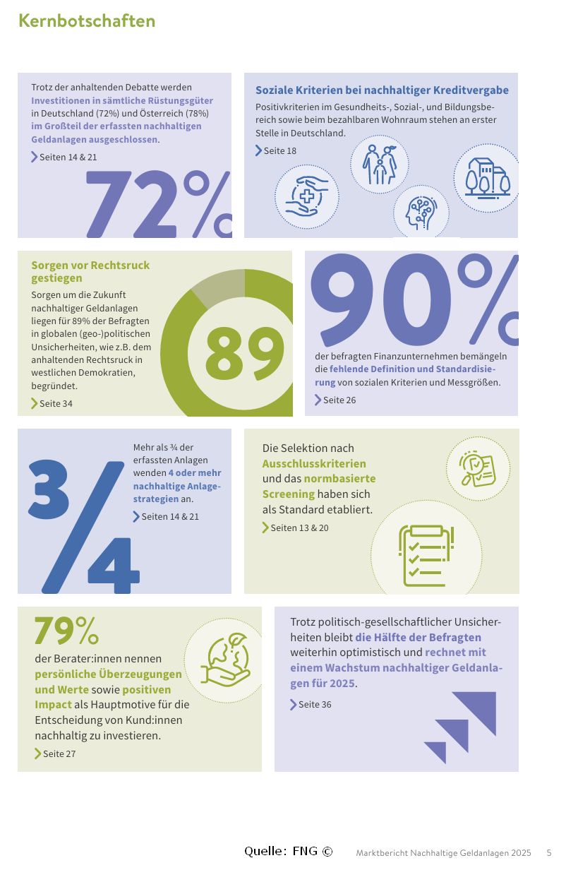 Nachhaltige Geldanlagen werden in Deutschland immer stärker nachgefragt. In Publikumsfonds, Mandate und Spezialfonds wurden im Jahr 2024 insgesamt 555 Milliarden investiert. Gegenüber dem Vorjahr ist das ein Plus von rund 17 Prozent, im Vergleich zu dem geringen Niveau des Jahres 2014 liegt der prozentuale Anstieg sogar bei über 900 Prozent. Aktien und Unternehmensanleihen sind dabei die dominierenden Assetklassen innerhalb der nachhaltigen Geldanlagen. Diese Asset-Allokation ist laut der Quelle, dem Forum Nachhaltige Geldanlagen, über die Jahre insgesamt stabil. Nachhaltige Anlagestrategien scheinen sich also auf einem festen Fundament zu bewegen, ohne dass es größere Verschiebungen zwischen den einzelnen Anlageklassen gibt.