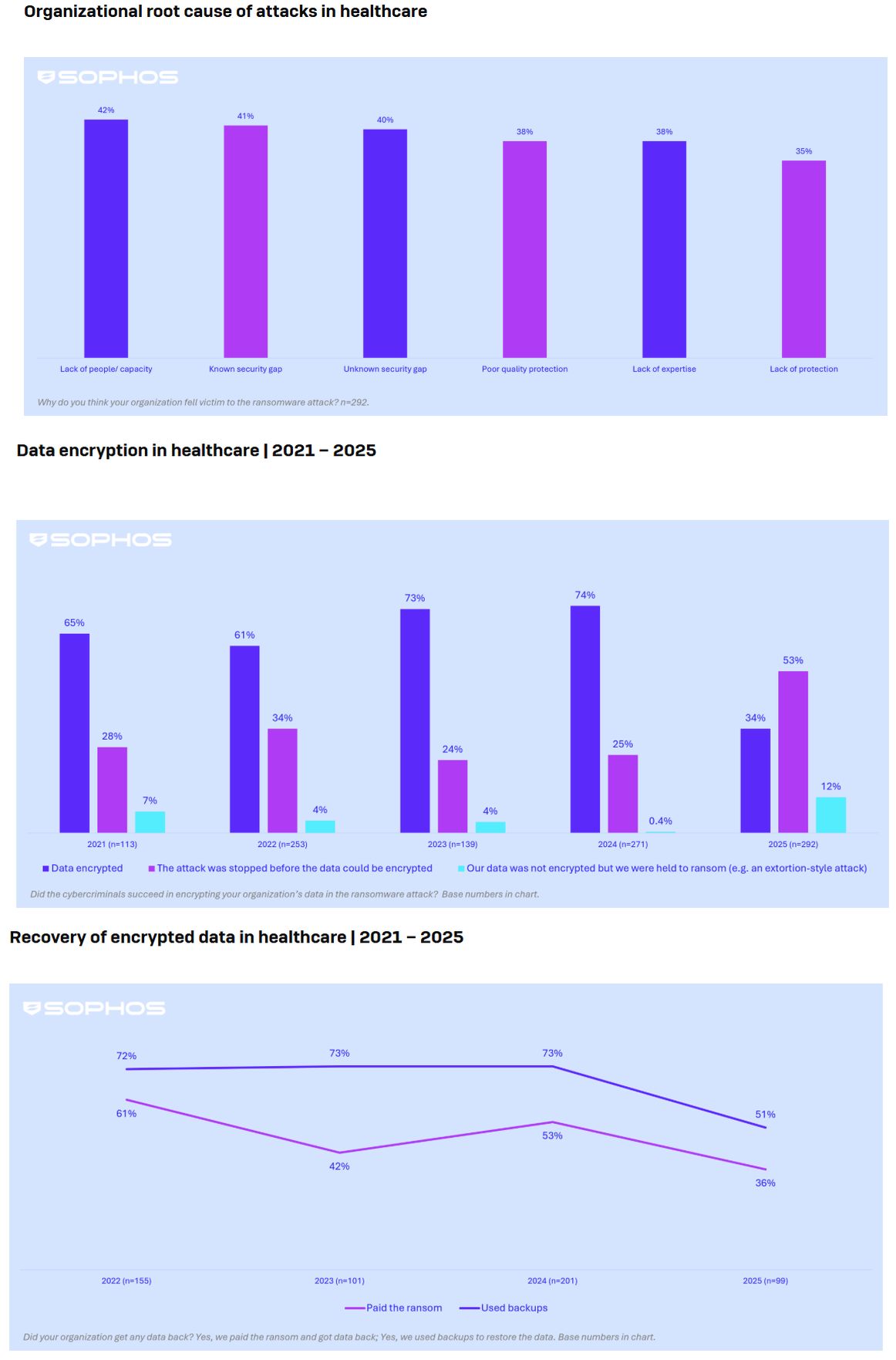 Im Jahr 2025 zahlten nur noch 36 Prozent der Gesundheitsorganisationen das geforderte Lösegeld. Dies ist ein deutlicher Rückgang insgesamt, lag dieser Wert im Jahre 2022 z.B. noch bei 61 Prozent. Damit gehört dieser Sektor zu den vier Sektoren, die am seltensten über Lösegeldzahlungen ihre Daten wiederherstellten. Gleichzeitig sank auch die Nutzung von Backups zur Datenrekonstruktion nach einem Angriff auf 51 Prozent. Dies könnte auf eine stärkere Widerstandsfähigkeit aber auch mangelndes Vertrauen in die Backup-Resilienz hinweisen.