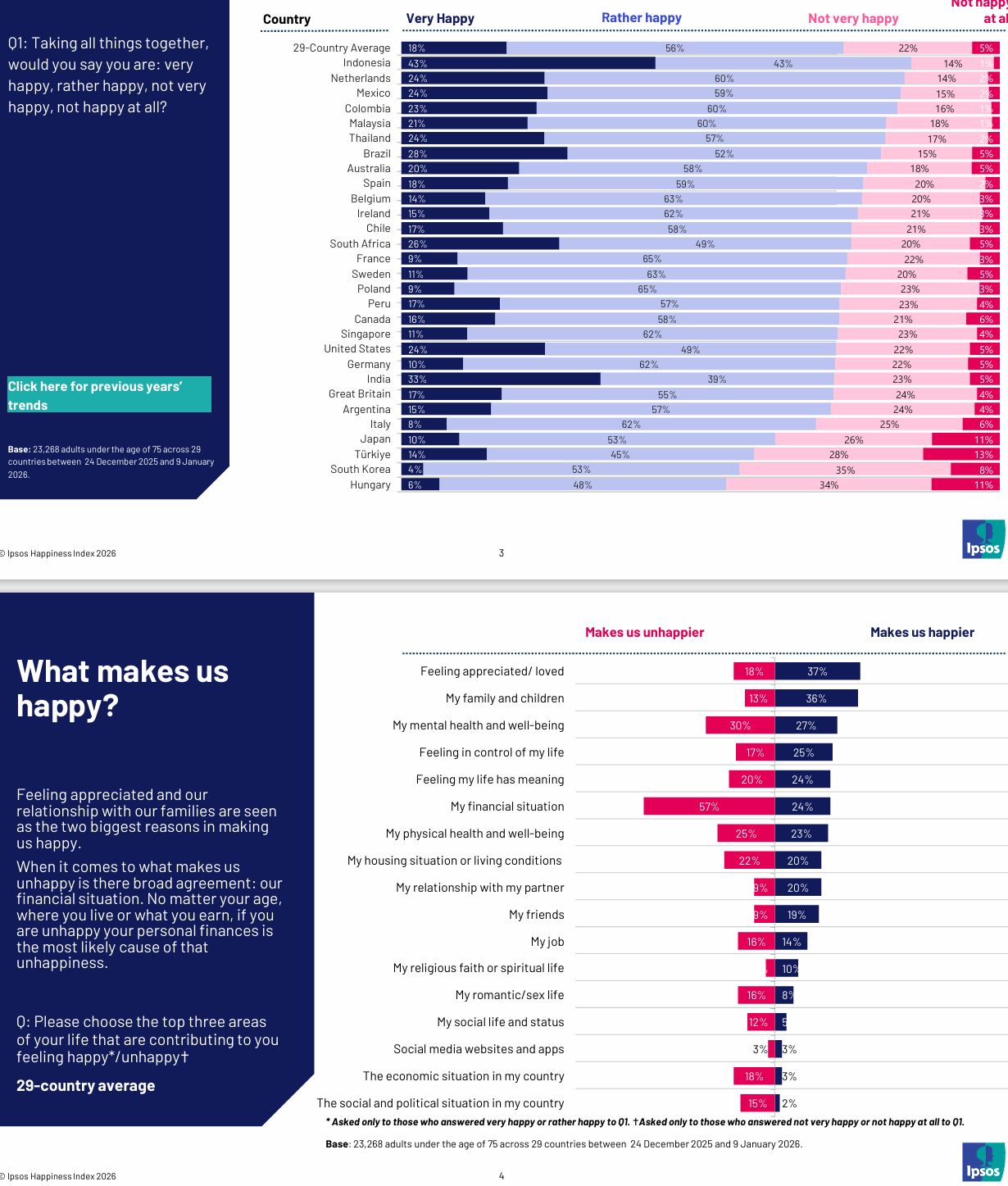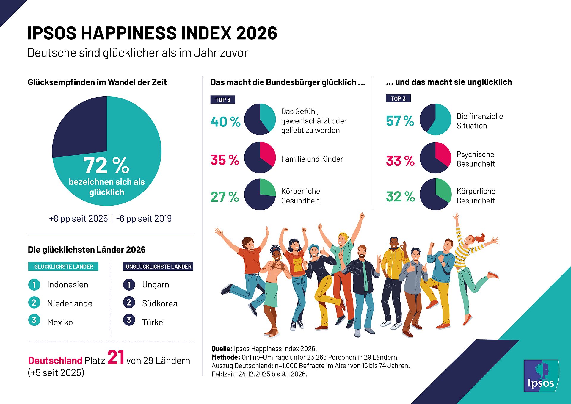 [1] Dies sind die Ergebnisse des Ipsos Happiness Report 2026. Für die Online-Umfrage wurden zwischen dem 24. Dezember 2025 und dem 9. Januar 2026 insgesamt 23.268 Personen in 29 Ländern auf der Online-Plattform Global Advisor befragt. In Deutschland waren die Befragten zwischen 16 und 74 Jahre alt, die Stichprobe umfasste rund 1.000 Personen.