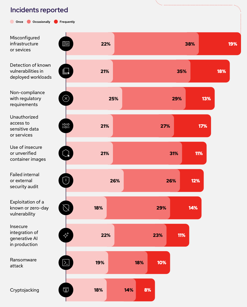 Fast alle Unternehmen mit hybriden Cloud-Umgebungen haben mit Sicherheitsproblemen zu kämpfen. Das geht aus dem aktuellen »The State of Cloud-native Security«-Report von Red Hat hervor [1]. Von den rund 600 befragten IT-Professionals gaben 97 Prozent an, in den vergangenen zwölf Monaten mindestens einen Cloud-nativen Sicherheitsvorfall erlebt zu haben.