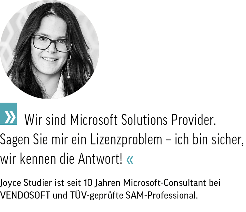 Schloss Bensberg, IT-Strategietage. Zwischen Fachvorträgen und Kaffeepause kommen der IT-Regionalleiter und der Lizenz-manager eines großen Handelsunternehmens ins Gespräch mit Joyce Studier von VENDOSOFT. Der erste Satz fällt augenzwinkernd: »Ihr seid also Lizenz-Dandler.« Eine Anspielung darauf, dass am Stand gebrauchte Software beworben wird. Die SAM-Expertin kontert: »Ne, wir sind Microsoft Solutions Provider. Sagen Sie mir ein Lizenzproblem – ich bin sicher, wir kennen die Antwort!« Eine Aussage, die sich bewahrheiten soll.