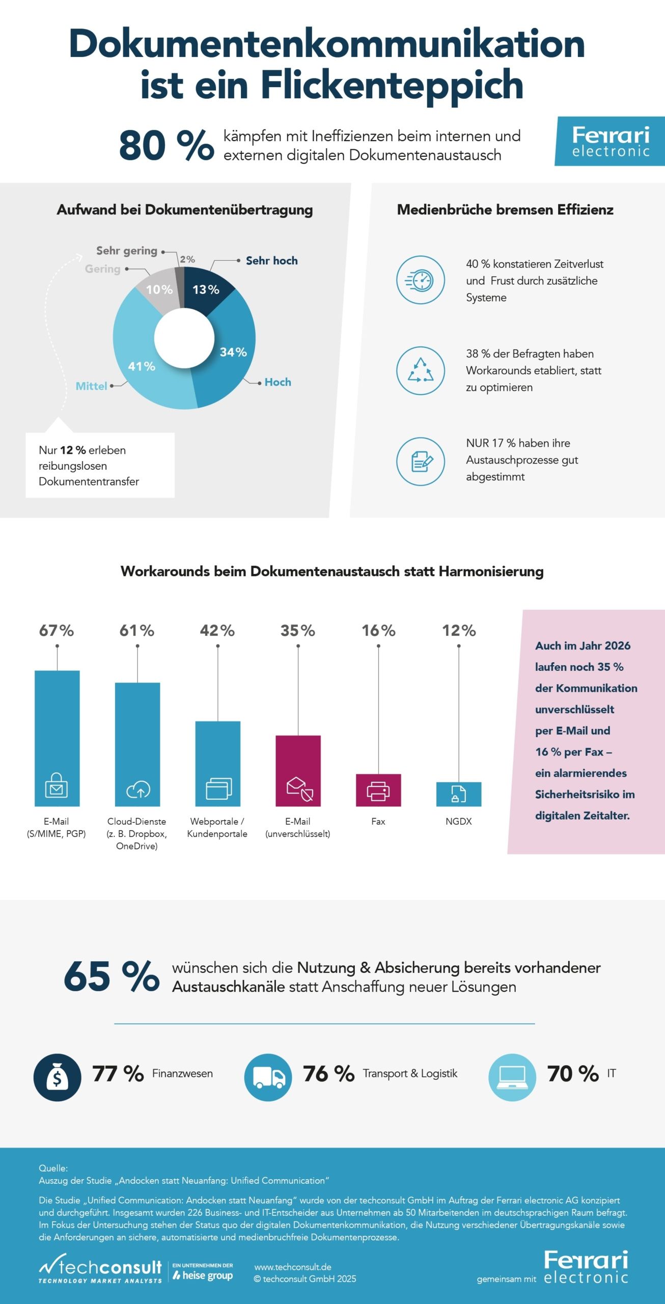 Die Dokumentenkommunikation in vielen befragten Unternehmen ist vielfach funktional, aber selten effizient, simple und nur bedingt sicher. Das ist das zentrale Ergebnis der Studie „Unified Communication: Andocken statt Neuanfang“, die von der techconsult GmbH durchgeführt wurde [1].