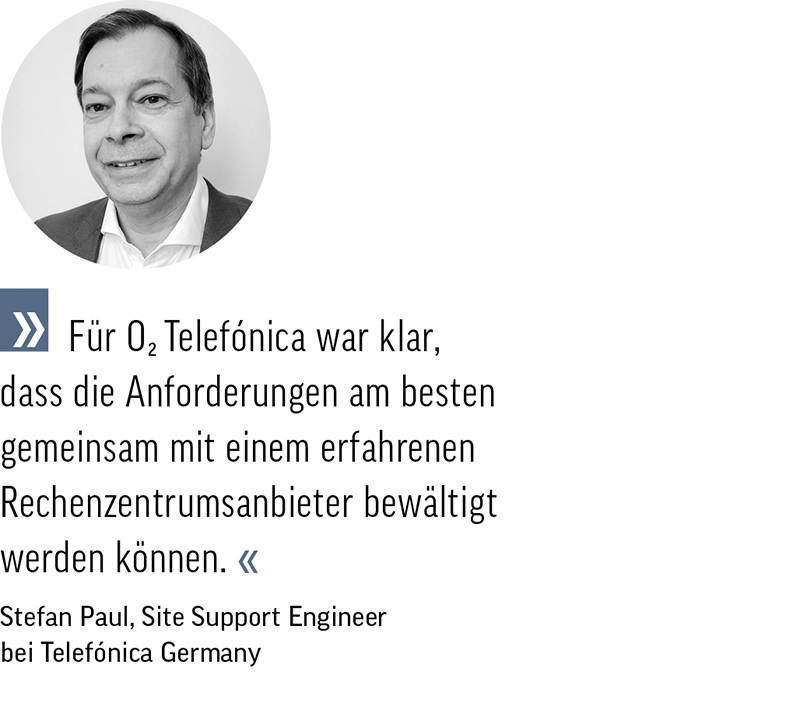 »Für O₂ Telefónica war klar, dass diese Anforderungen am besten gemeinsam mit einem erfahrenen Rechenzentrumsanbieter bewältigt werden können«, sagt Stefan Paul, Site Support Engineer bei Telefónica Germany. Gleichzeitig sollte im Rahmen einer neuen Kooperation die IT-Infrastruktur nachhaltig gestaltet werden, um den ökologischen Fußabdruck des Unternehmens zu minimieren.