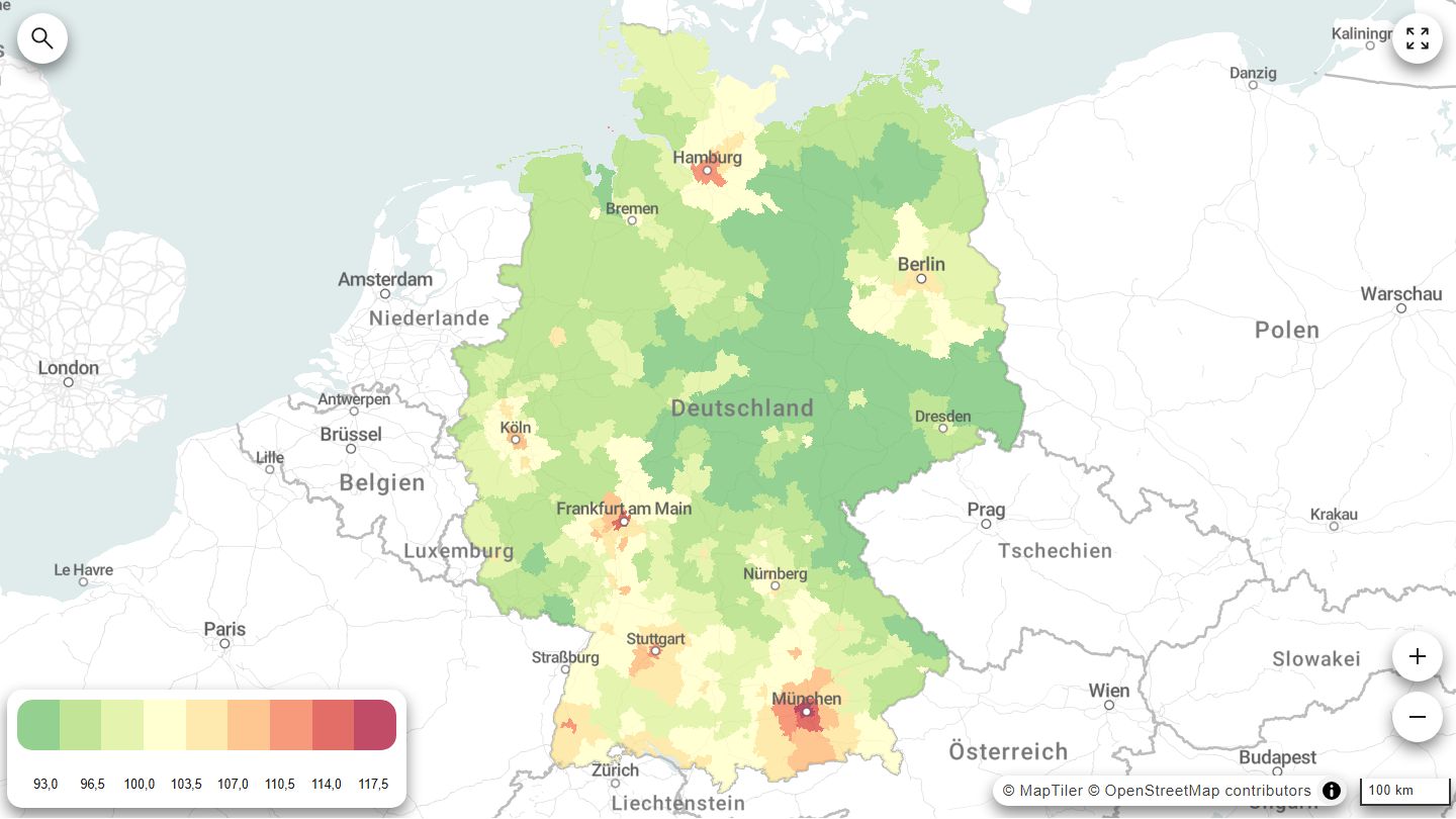 In den sieben größten Städten Deutschlands – Berlin, Düsseldorf, Frankfurt am Main, Hamburg, Köln, München und Stuttgart – ist das Leben am teuersten. Im Jahresdurchschnitt 2024 lagen die Lebenshaltungskosten hier rund elf Prozent über dem Bundesschnitt. Das geht aus dem Regionalen Preisindex hervor, den das IW gemeinsam mit dem Bundesinstitut für Bau-, Stadt- und Raumforschung (BBSR) erstellt hat. Der Preisindex vergleicht die Wohn- und Lebenshaltungskosten – darunter Mieten, Strom, Gas und Lebensmittel – in allen 400 Kreisen und kreisfreien Städten Deutschlands. Er basiert auf automatisierten Big-Data-Analysen frei zugänglicher Internetportale, von Rewe bis zu Verivox.