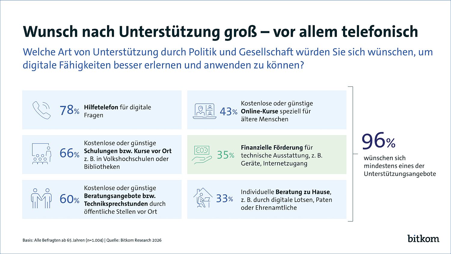 Die große Neugierde und Offenheit für Digitales kommen mit einem ebenso großen Wunsch nach Unterstützung: Generell finden 91 Prozent, der Staat sollte mehr dafür tun, dass niemand bei der Digitalisierung abgehängt wird. Fast alle (96 Prozent) wünschen sich ein Unterstützungsangebot, um digitale Fähigkeiten besser erlernen und anwenden zu können: Konkret wünschen sich 78 Prozent der Menschen über 65 ein Hilfetelefon für digitale Fragen. 66 Prozent wünschen sich kostenlose oder günstige Schulungen bzw. Kurse vor Ort, zum Beispiel in Volkshochschulen oder Bibliotheken, 60 Prozent kostenlose oder günstige Beratungsangebote bzw. Techniksprechstunden durch öffentliche Stellen vor Ort. Kostenlose oder günstige Online-Kurse speziell für ältere Menschen wünschen sich 43 Prozent, um ihre Digitalkompetenzen zu stärken. Ein Drittel (33 Prozent) wünscht sich individuelle Beratung zu Hause, zum Beispiel durch digitale Lotsen, Paten oder Ehrenamtliche. 35 Prozent wünschen sich eine finanzielle Förderung für ihre technische Ausstattung.