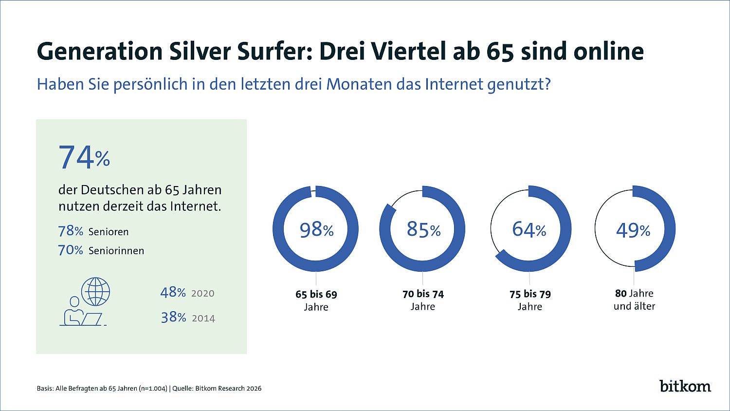 Insgesamt 74 Prozent der Internetnutzerinnen und -nutzer ab 65 Jahren können sich ein Leben ohne Internet nicht mehr vorstellen. 91 Prozent finden im Internet Freizeitaktivitäten, 78 Prozent nutzen das Netz, um gedanklich fit zu bleiben. 72 Prozent haben dank des Internets mehr Kontakt zu Freunden und Familie.
