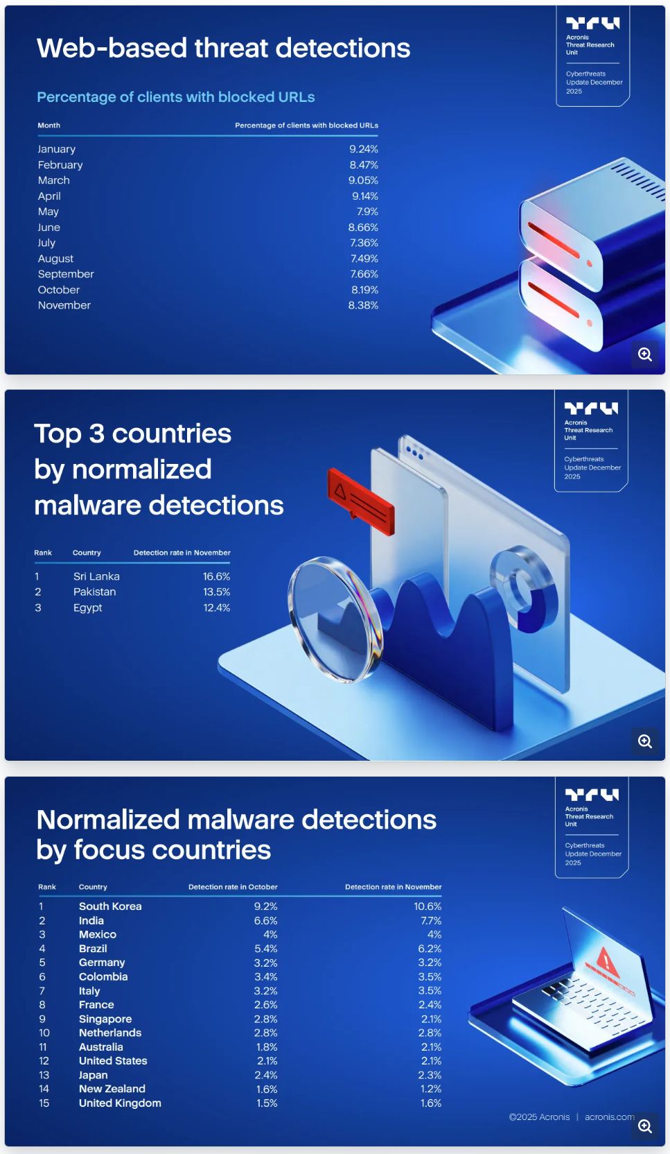Das Acronis Cyberthreats Update stellt monatlich aktuelle Erkenntnisse zur Bedrohungslage sowie Einschätzungen der Expert:innen der Acronis Threat Research Unit (TRU) zur Verfügung, damit Unternehmen und Privatpersonen sich vor den sich ständig weiterentwickelnden Sicherheitsherausforderungen schützen können. Im November 2025 blockierten Acronis-Lösungen weltweit mehr als 25 Millionen schädliche URLs – ein Anstieg von rund 82 Prozent gegenüber dem Vormonat.