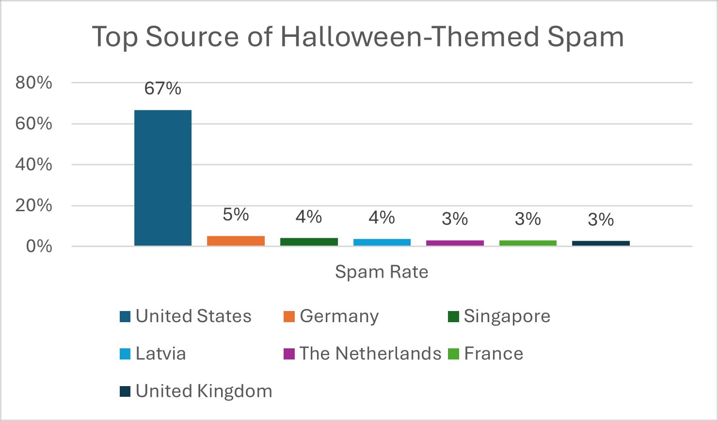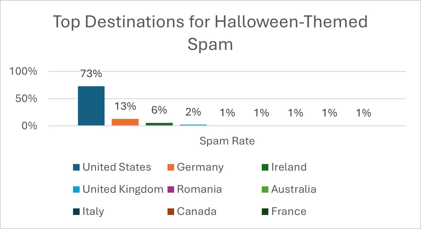 Deutschland auf Rang Zwei als Zielland für Spambetrug. Fünf Prozent des Spams stammen aus Deutschland. 63 Prozent des Spams mit Halloween-Bezug sind bösartig und beabsichtigen, Malware zu implementieren oder Zugangsdaten oder Geld zu stehlen.
