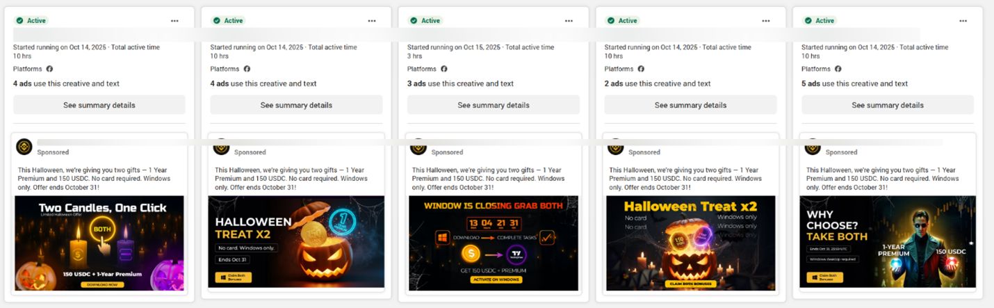 Die Experten der Labs entdeckten zudem ein verborgenes Netz von Halloween-Anzeigen über die Meta-Plattformen Facebook und Instagram. Hier erwarben die Betrüger gesponsorte Anzeigenplatzierungen für ihre betrügerischen Angebote oder sogar mit direktem Link auf Malware. Eine der wichtigsten Taktiken, um Malware zu vertreiben, sind gesponserte Anzeigen in sozialen Medien, die sich als Werbeangebote tarnen.