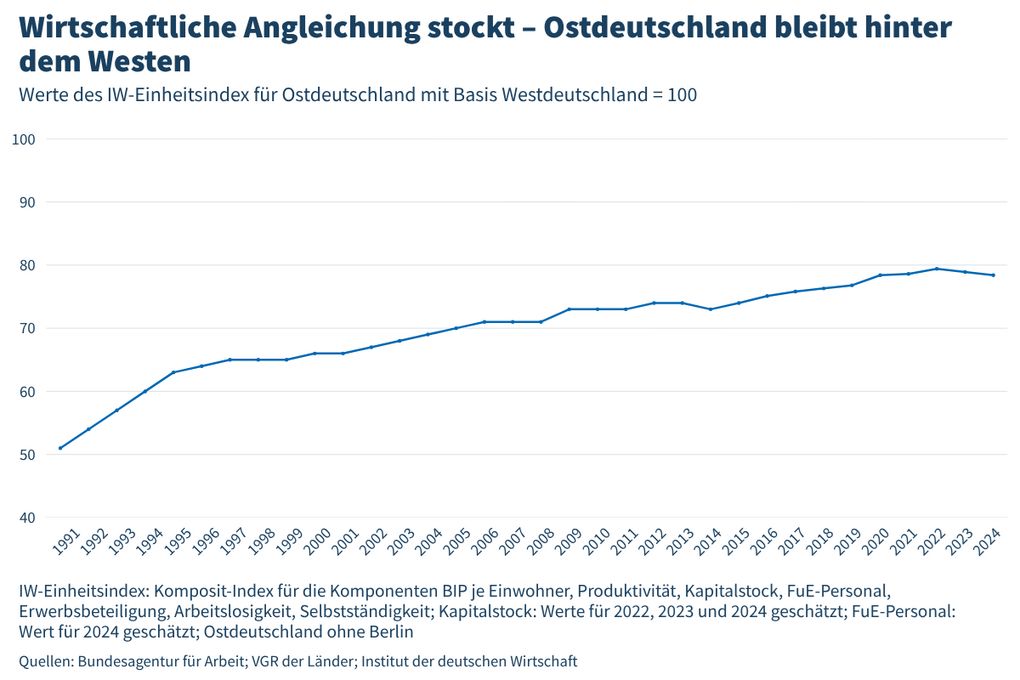 Seit der Wiedervereinigung hat Ostdeutschland wirtschaftlich zwar aufgeholt, der Rückstand zum Westen bleibt aber groß, zeigt eine Analyse des Instituts der deutschen Wirtschaft (IW).