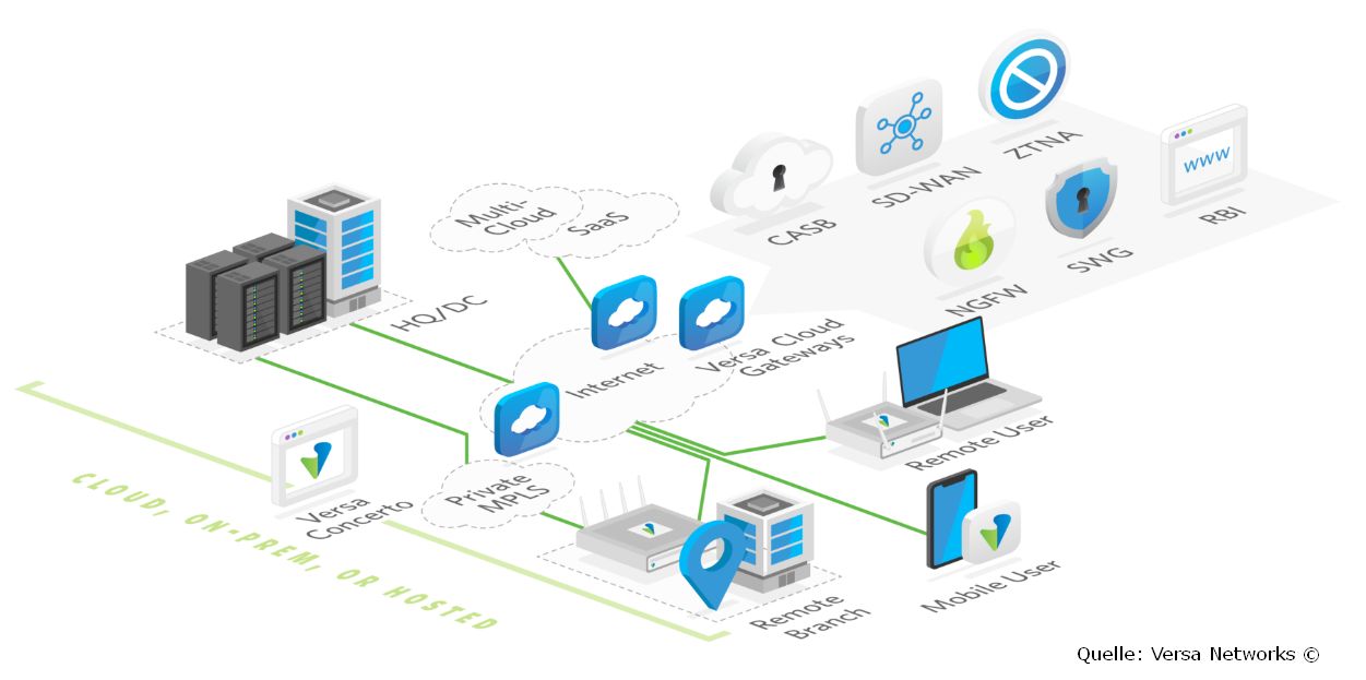 Versa SASE integriert Sicherheit, Netzwerke, SD-WAN und Analysen in einem einzigen Software-Betriebssystem, das über die Cloud, am Standort oder in einer Kombination aus beidem bereitgestellt wird.