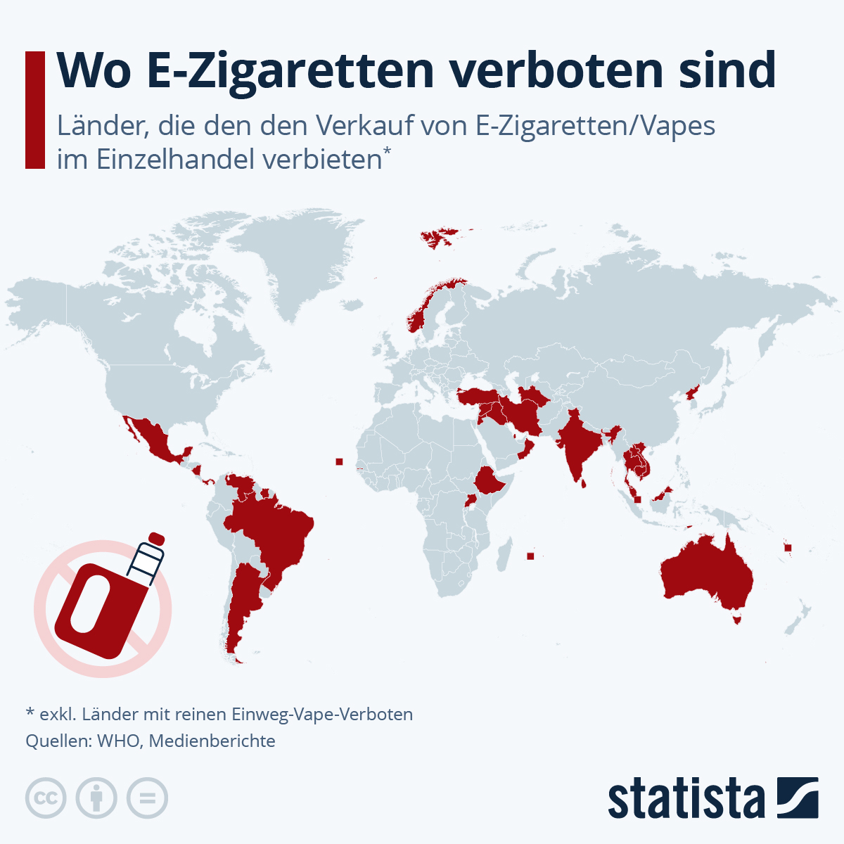 Mehr als dreißig Länder weltweit haben laut einer Erhebung der World Health Organization aus dem Jahr 2023 und aktueller Medienberichte Verkaufsverbote sowohl für Mehr- als auch Einweg-E-Zigaretten und Vapes erlassen [1]. Ein Großteil davon befindet sich in Südamerika und Asien, in Europa existiert ein entsprechendes Verbot nur in Norwegen. Zu weiteren hinsichtlich der Wirtschaftsleistung relevantesten Ländern mit einem mindestens für den Einzelhandel gültigen Verkaufsverbot für E-Zigaretten gehören Australien, Indien, Brasilien und Singapur. Zuletzt hatte sich Vietnam der Gruppe an Ländern angeschlossen, in denen E-Zigaretten im Allgemeinen verboten sind.